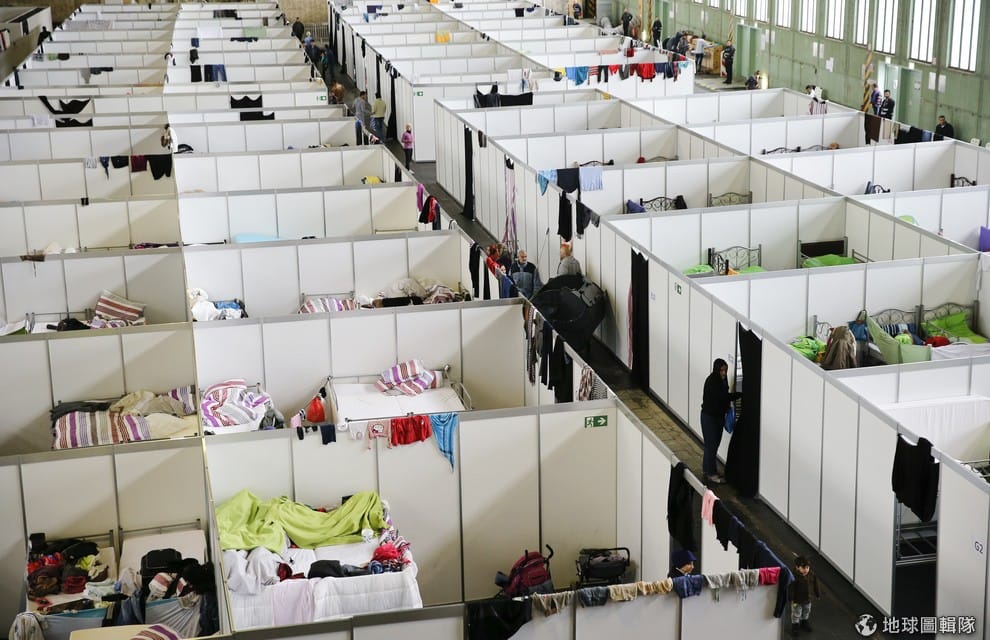 圖為位於柏林的滕珀爾霍夫機場,政府將此地改為大型難民營,他們用隔板和上下舖搭建出可以容納上千名難民的空間。