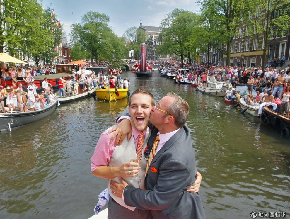 對於同性戀來說,荷蘭阿姆斯特丹宛如天堂,當地對LGBT團體開放的態度吸引不少人移居。圖為一對同志伴侶在阿姆斯特丹同志大遊行上親吻。