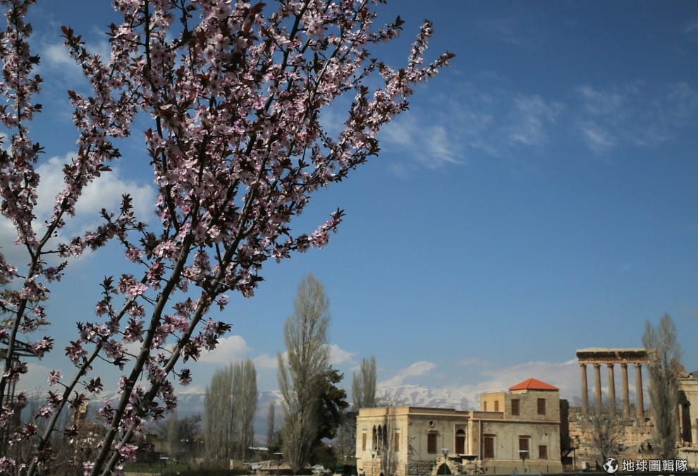 中東 5個國家聯合禁止民眾到黎巴嫩玩。圖為黎巴嫩當地的朱比特(Jupiter)神廟與粉色櫻花。