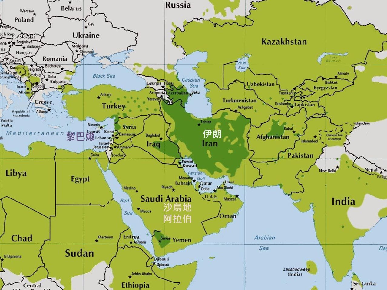 從美國中情局製作的地圖可以發現,淺綠色的部分代表遜尼派穆斯林,深綠色的部分代表什葉派穆斯林。黎巴嫩有什葉派也有遜尼派,沙國以遜尼派穆斯林為大宗,伊朗則以什葉派穆斯林為主。