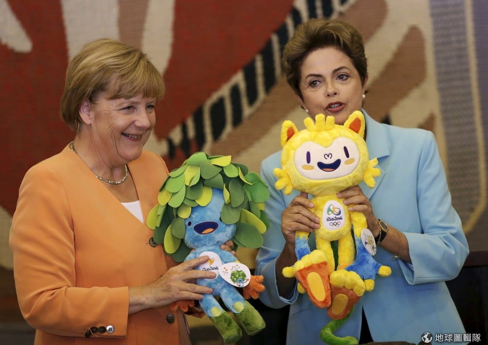 德國總理梅克爾(左)和巴西總統羅塞夫手上拿著 2016里約奧運的吉祥物。國際奧委會主席巴赫表示,巴西人不像德國人很早就買票,雖然現在奧運門票還賣不到一半,但他對銷售有信心。