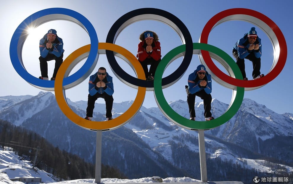 2014年,奧地利奧運滑雪隊的成員和代表奧運的五色環拍照。他們和家園遭毀的難民選手不同,可以代表國家參賽。