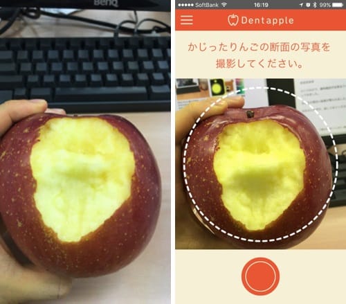 「Dentapple」專案的主角就是蘋果,首先,松本蘋果協會在每顆蘋果上都貼有一張 QR code 貼紙,在大快朵頤之前,你必須掃瞄它來下載軟體應用程式(同時支援 iOS 及 Android 系統),接下來,介面會教你該如何咬蘋果,像是用左側小臼齒區咬、全口切咬等不同方式,總計必須咬 4 口,之後再用手機拍下咬痕。