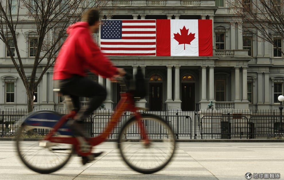 一名單車騎士看著華盛頓特區艾森豪行政辦公大樓外牆上,醒目並排的美國和加拿大國旗。加拿大位於美國上方,但長期受到鄰國的忽略,新上任的加國總理杜魯道也呼籲美國要「多多關注這個世界」。