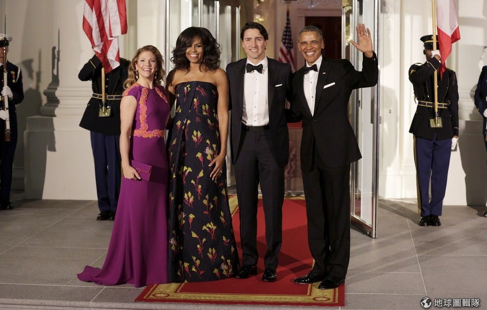 10號這天,加拿大總理來到美國,受到美國總統歐巴馬的設宴款待,這也是近二十年來美國總統首次替加國總理舉行晚宴。由左至右分別是加拿大總理夫人蘇菲、美國第一夫人蜜雪兒、加拿大總理杜魯道和美國總統歐巴馬。