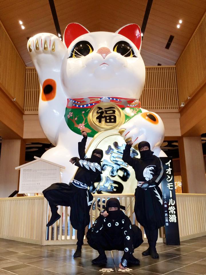 網友徳川家康と服部半蔵忍者隊生在現代的日本忍者任務已經從暗殺變成推廣觀光,在不少名勝古蹟都可以看到他們的蹤影。圖為和招財貓合影的忍者。