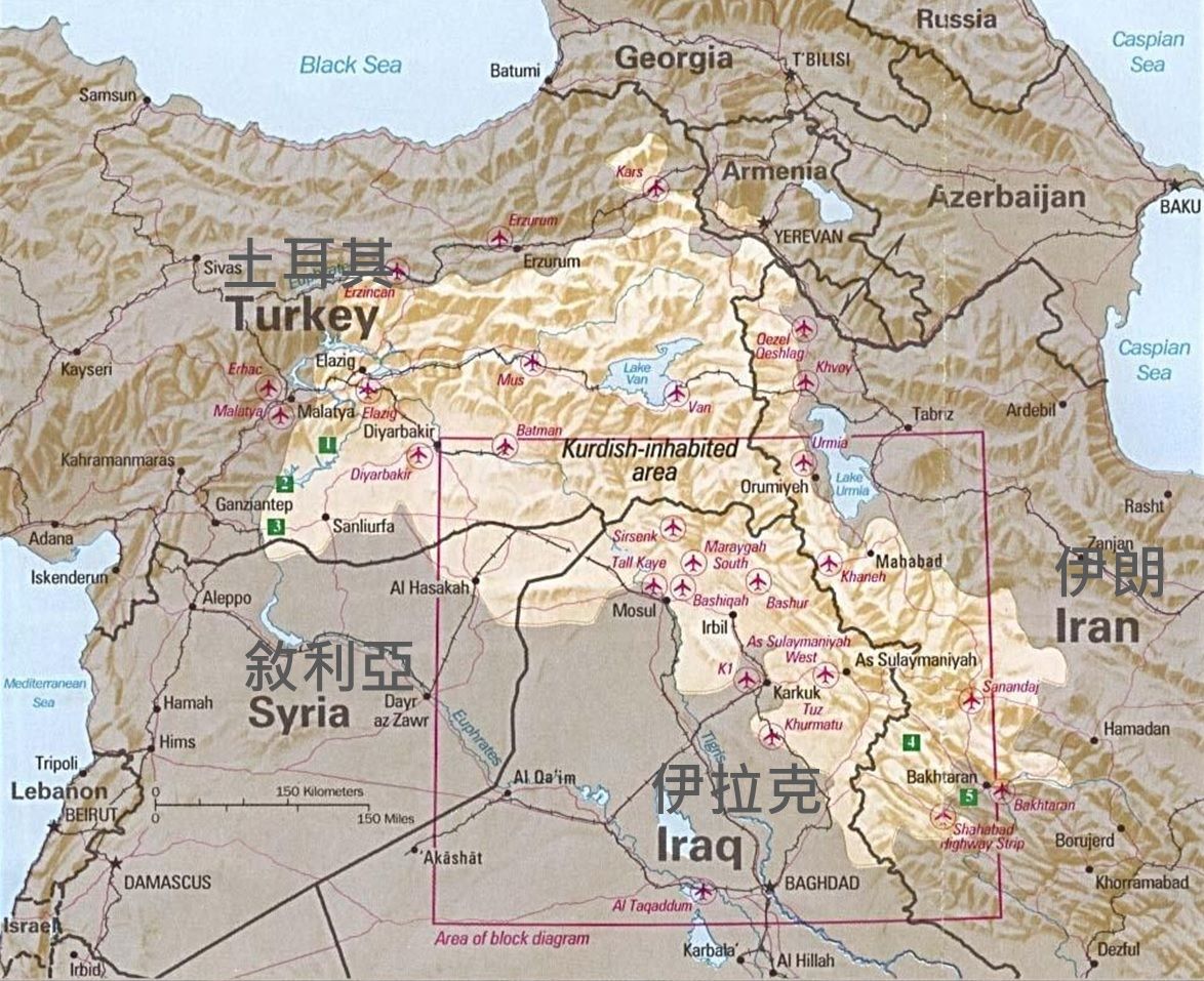 庫德人居住在伊拉克、敘利亞、土耳其和伊朗 4個國家境內,上圖的淺黃色區域就是庫德人分佈的區域。編譯:地球圖輯隊