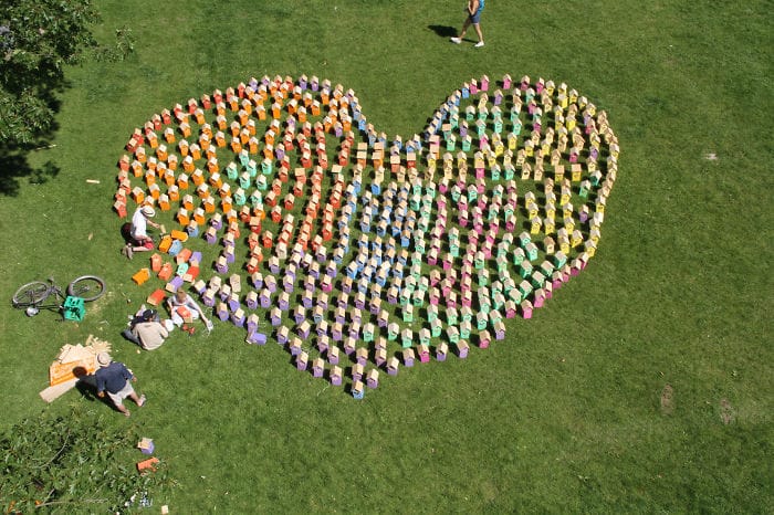 網友Thomas Dambos2012年,丹柏斯成立工作坊邀請大家一起來彩繪鳥屋,並用現場的 640座彩色鳥屋排出心型。