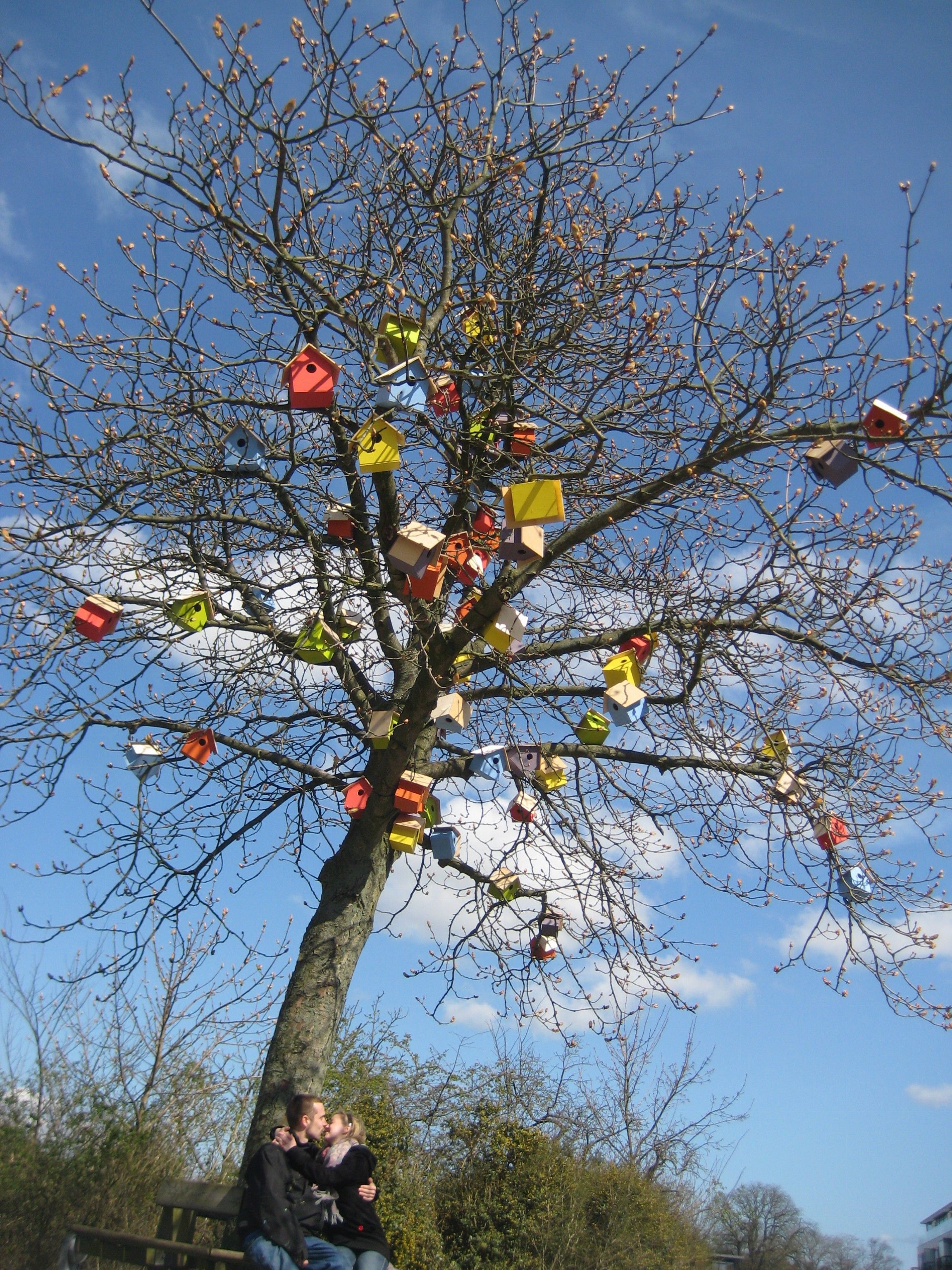 一對戀人在掛滿鳥屋的樹下擁吻,你知道這一棵樹上有多少座鳥屋嗎?