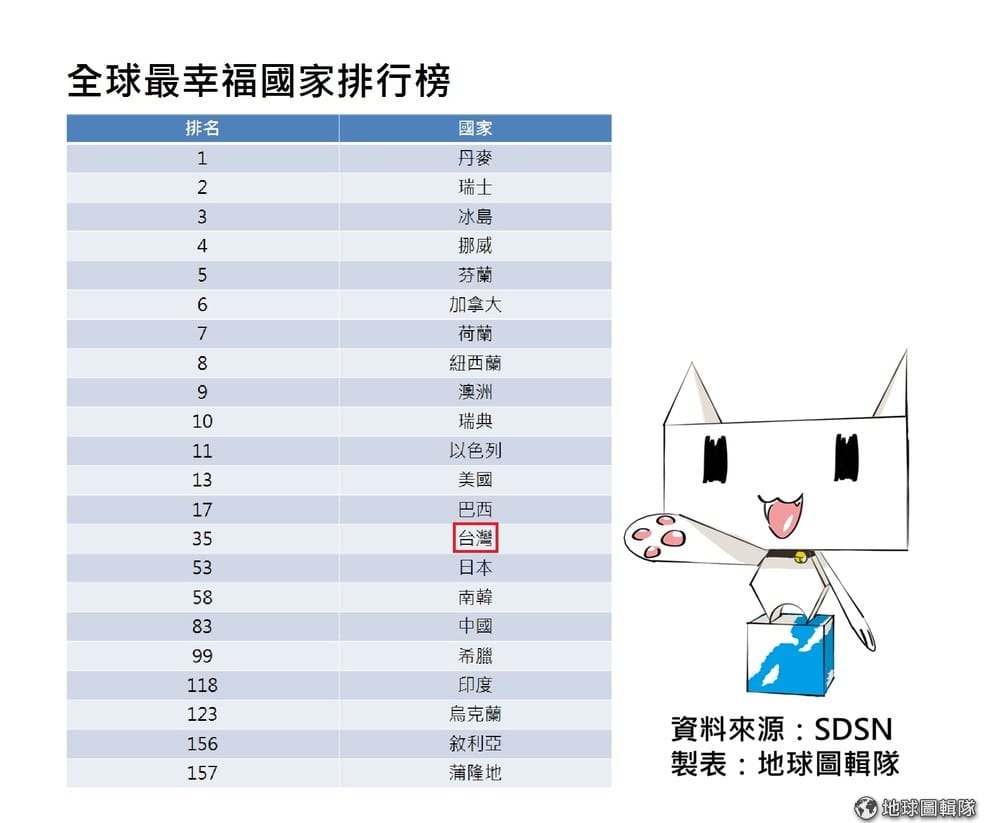 圖為最新出爐的全球最幸福國家排行榜,可以看到前五名有四名都在北歐,台灣則名列第 35名。