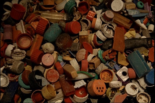 海鳥在覓食時常常不小心吞下寶特瓶的塑膠瓶蓋,圖為從水鳥肚子中取出的瓶蓋。