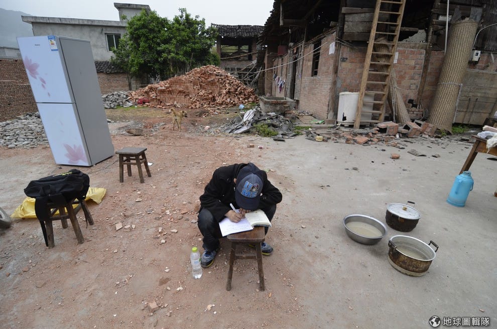 受到地震重創的雅安,當地許多人的家園一夕之間都沒了。照片中是一名學生正就著天光,寫著他的學校作業。ChinaFotoPress/ChinaFotoPress via Getty Images