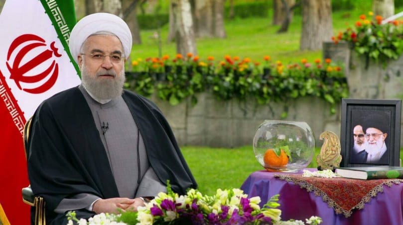 圖為向人民拜年的伊朗總統魯哈尼,他桌上的金魚缸中只有橘子,沒有金魚。