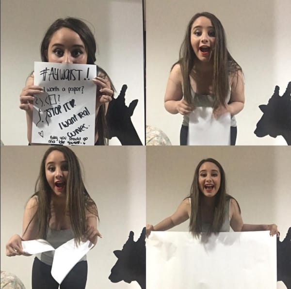 網友A4 Waist反對用細腰展現單一標準的抗議人士,在鏡頭前將A4紙撕掉,換成一張更大的紙。