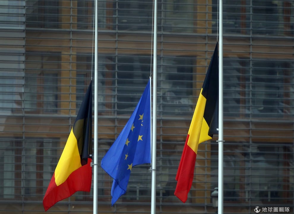 路透社布魯塞爾市區內的歐盟旗幟與比利時國旗一同降半旗致哀。