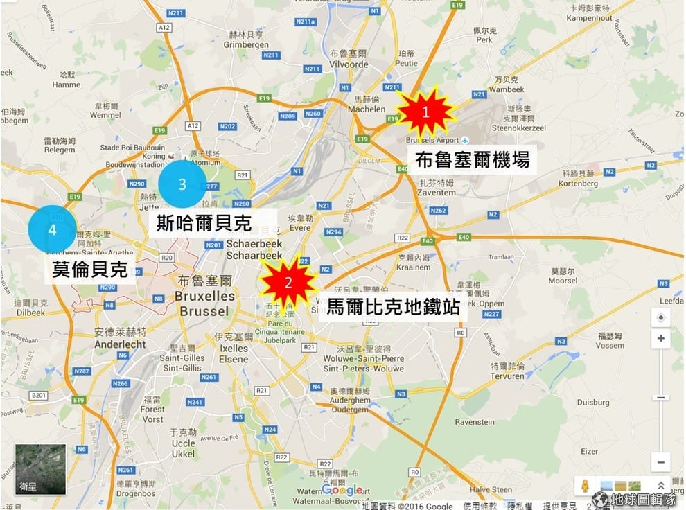 上圖是 3月22日爆炸案一覽。布魯塞爾機場最先發生炸彈攻擊,一小時後在不遠處的馬爾比克地鐵站也傳出爆炸。藍點3表示比利時警方之後查獲爆裂物與伊斯蘭國旗幟的地方。藍點4是巴黎恐攻主嫌聚集的莫倫貝克。