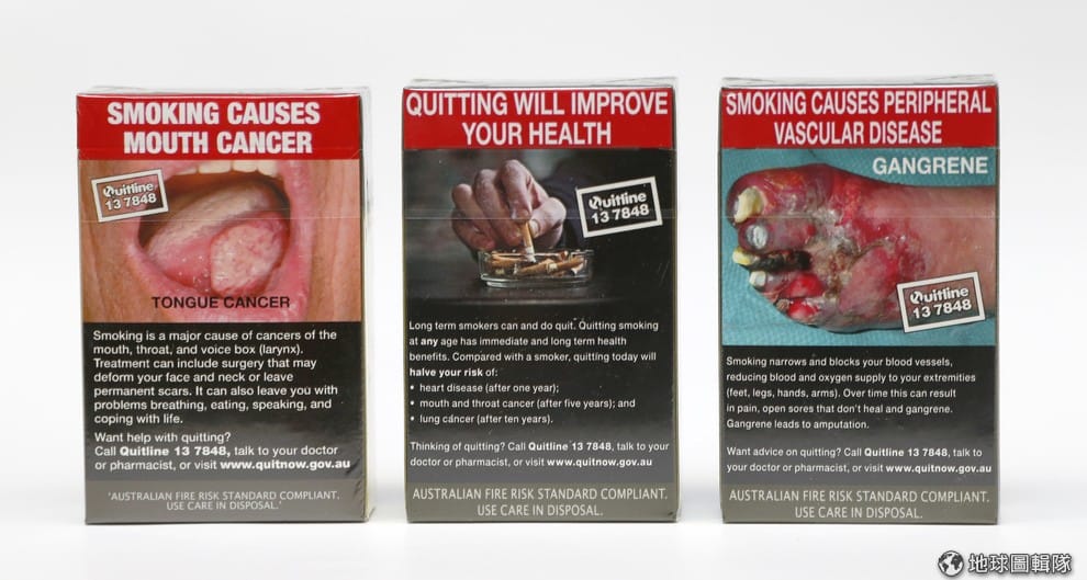 澳洲的香菸盒子上看不到品牌標誌,還有駭人的圖片警告買的人抽菸抽太多對身體不好。