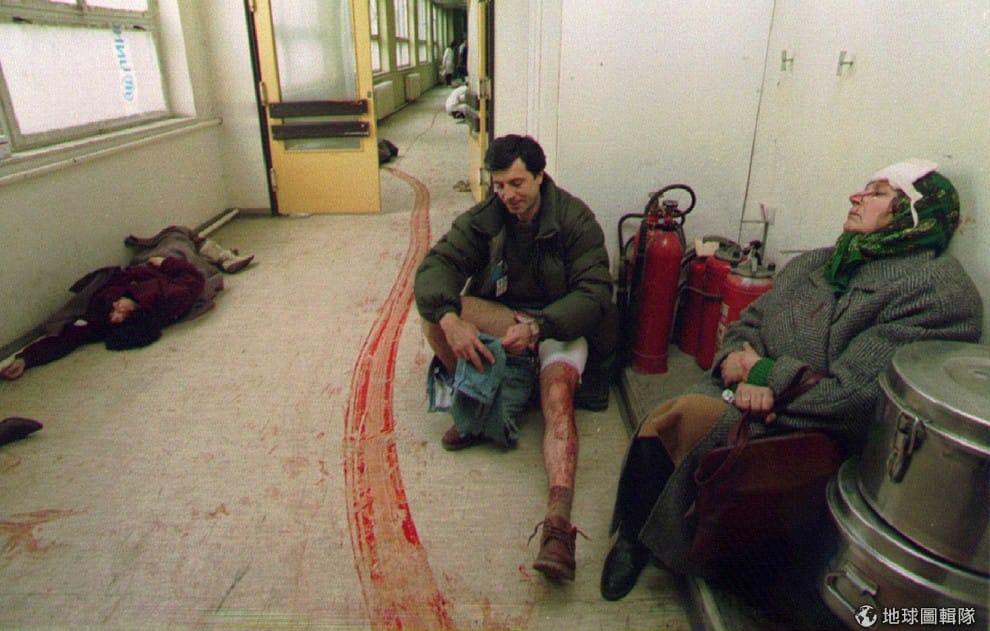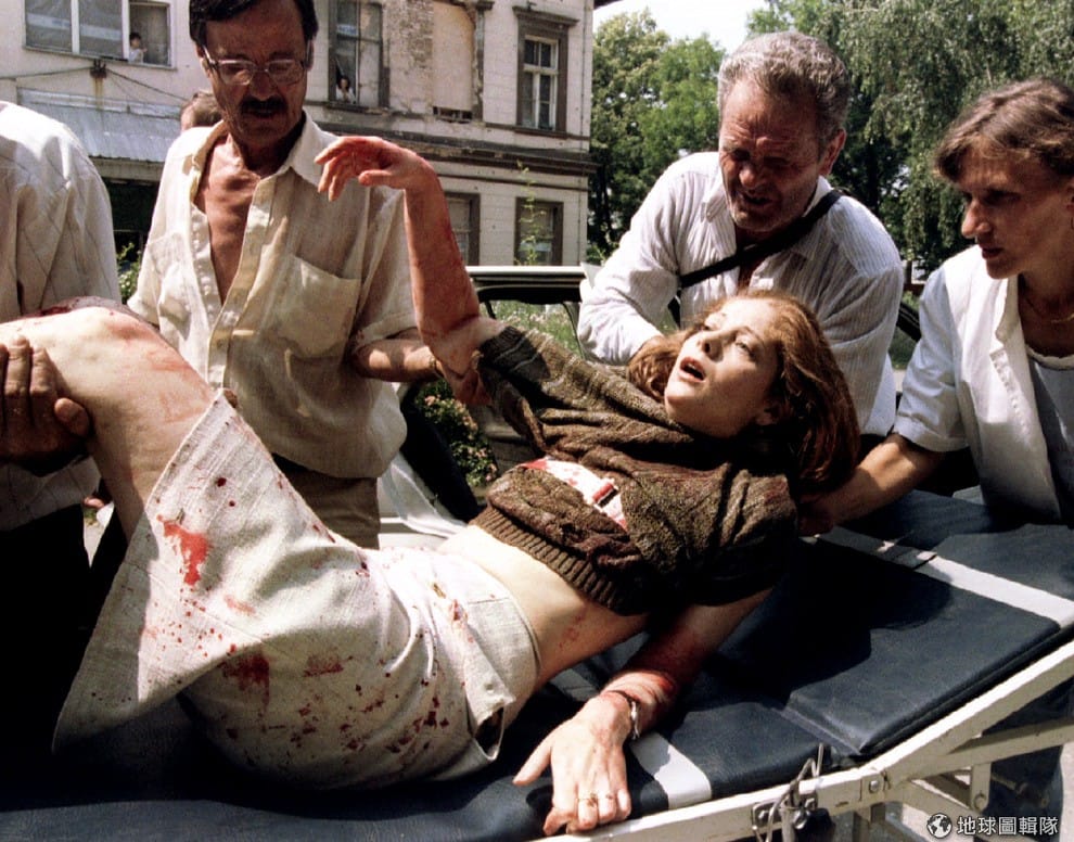 1995年7月,遭到空襲的塞拉耶佛市區內可見受傷民眾。當時,聯合國安理會為了遏止塞軍攻擊塞拉耶佛,正式請求北約組織立即空襲。