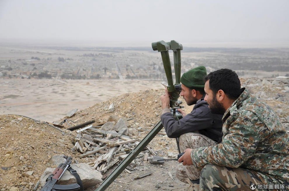 敘利亞政府軍正在觀察遠處的古城,他們從 3月開始不斷進逼位在帕米拉城的伊斯蘭國士兵,終於在 3月底傳出收復失土的好消息。