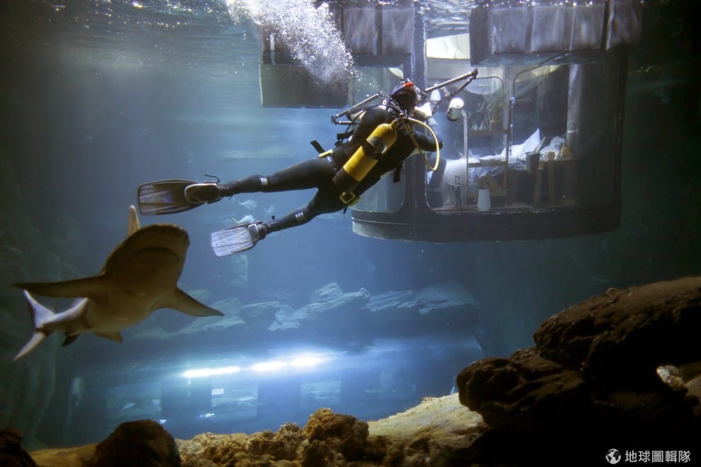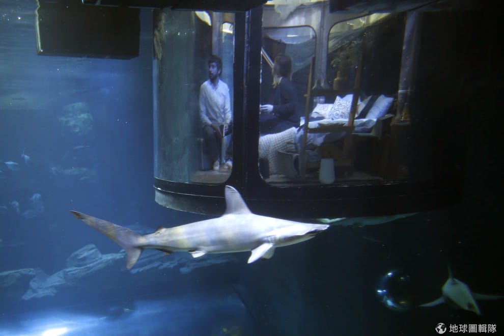 網友Airbnb360度都是玻璃的客房,讓房客能與 35隻鯊魚近距離接觸。