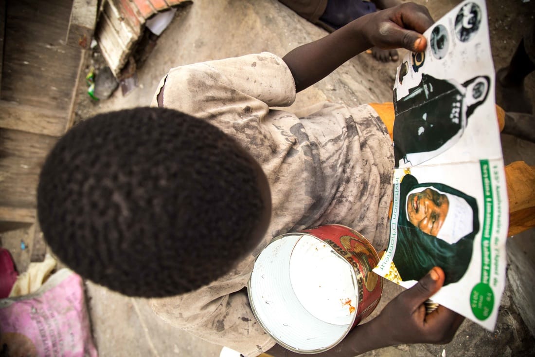 一名學生拿著空罐看著手上的宣傳單,在學校裡導師的地位很高,學生們必須上街乞討支付學費。