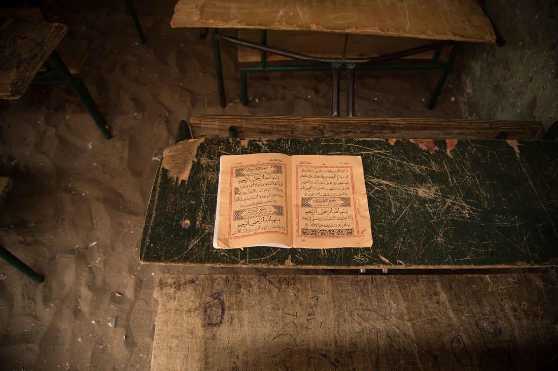 在塞內加爾伊斯蘭學校的書桌上,擺著一本寫滿經文的課本。