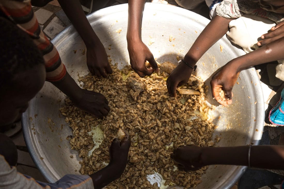 學生們將手伸向大盆中,用通心粉餵飽自己的肚子。