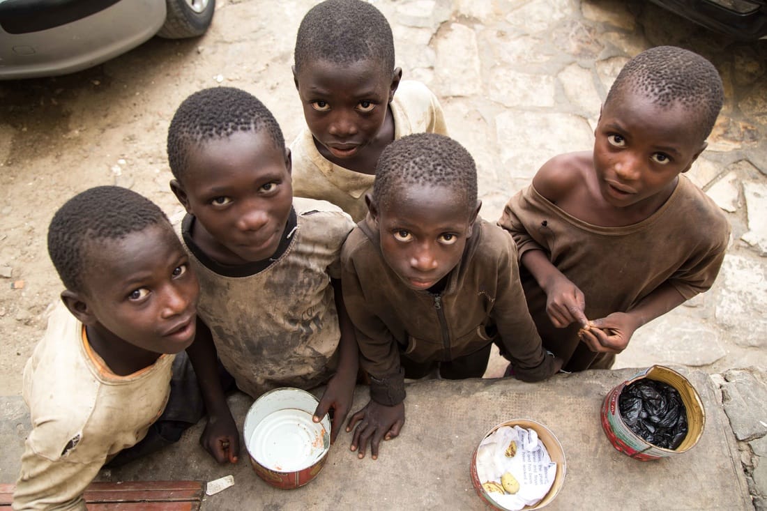 一名孩子在車陣中拿著空罐乞討,在塞內加爾這樣的景象很常見。