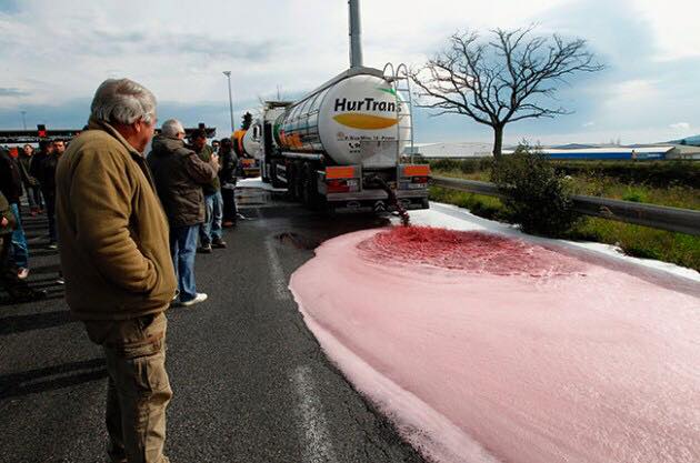 《電訊報》、BBC、France 24等媒體指出,入境法國的西班牙貨車被攔下後,法國葡萄酒業者一擁而上倒掉貨車上所有紅酒和白酒,換算之下,大約有 9萬支酒全被倒進路旁排水溝。