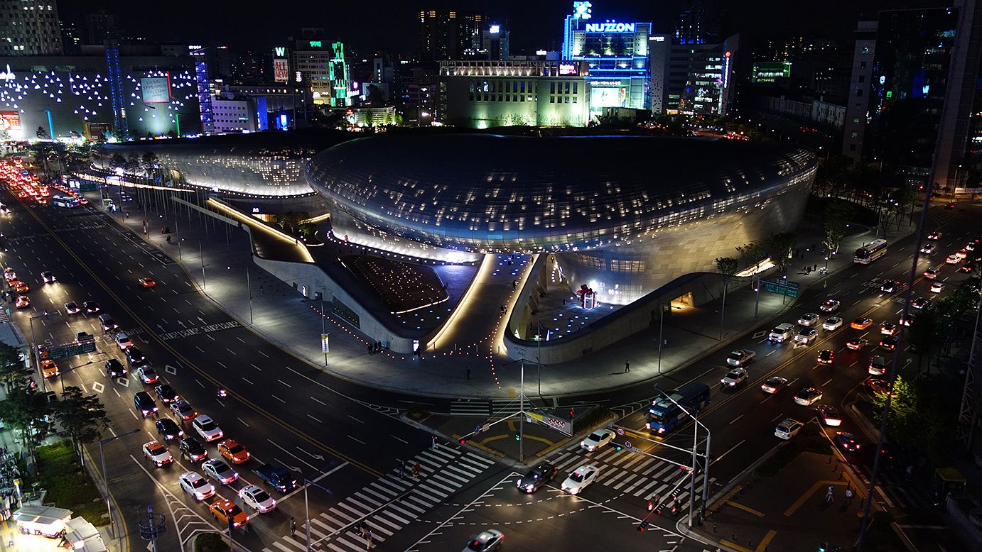 首爾市東大門設計廣場,整個建築是毫無接縫的流水線形,外觀呈曲線形像個巨大的外星宇宙飛船,內部沒有一根柱子。