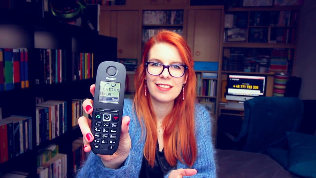 一名女子開心地向鏡頭秀出電話,她正準備和瑞典人聊天。
