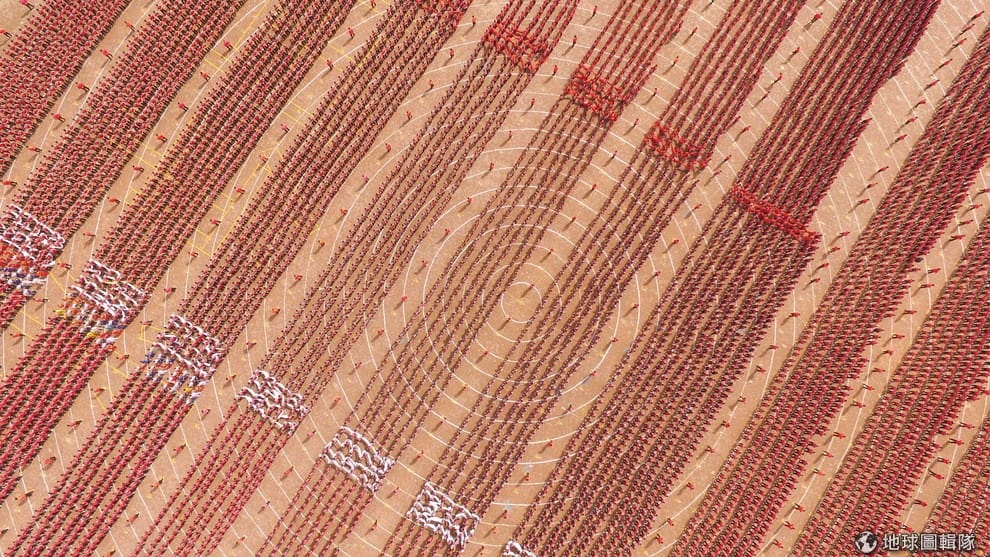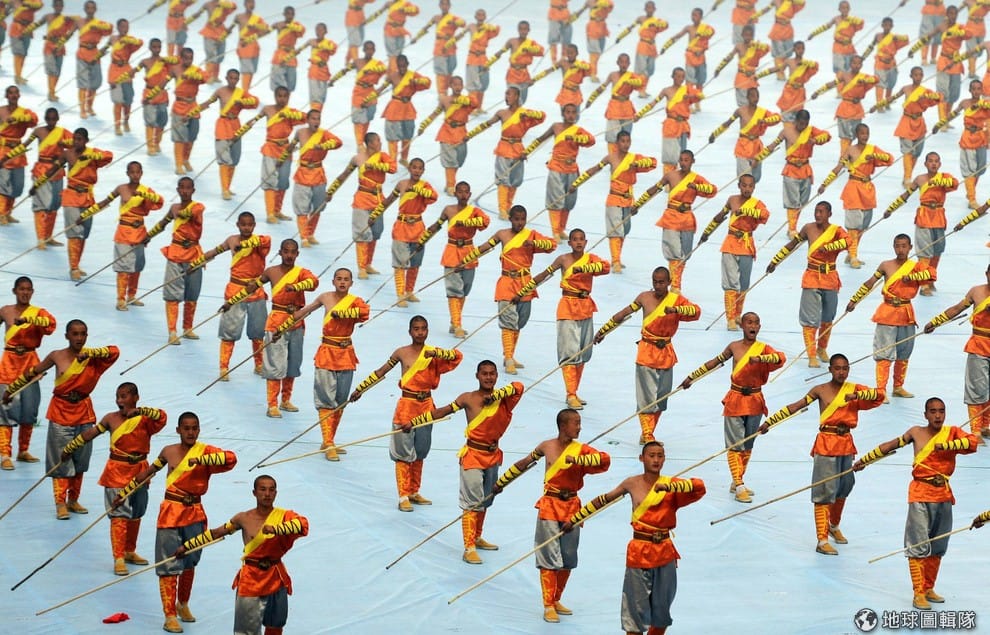 表演武術的學生們整齊劃一地動作,他們正歡慶少林武術節。中國鄭州國際少林武術節創辦於 1991年,宗旨為「以武會友,共同進步」。