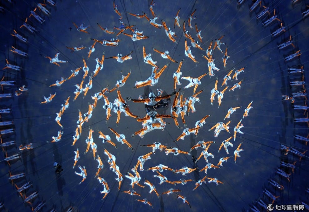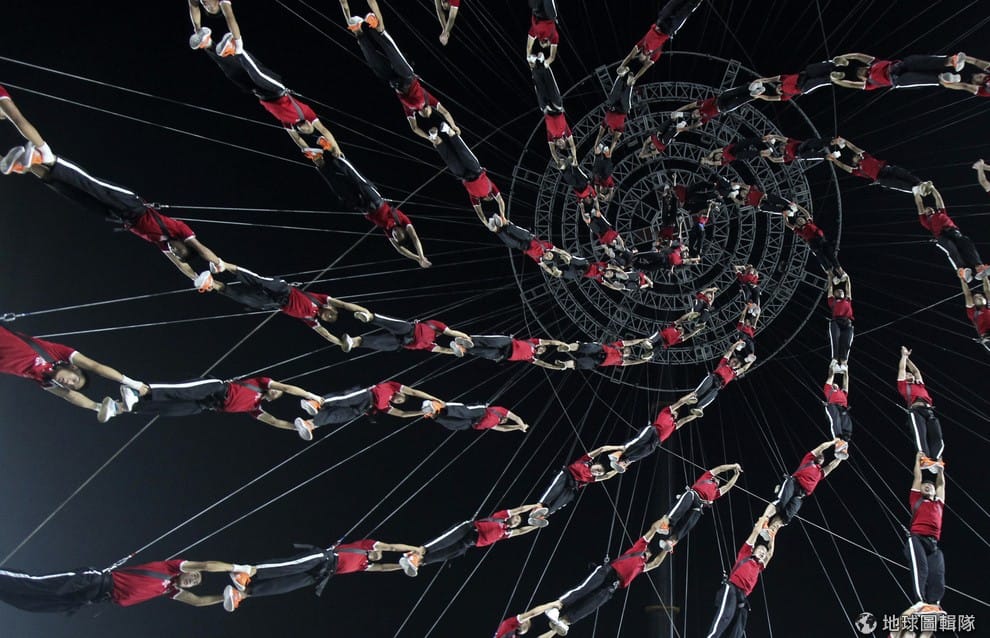 2014年時,南京市體育館中,可見學生們身上繫著鋼索準備排出各種令人咋舌的圖樣。他們為了南京青年奧運會開幕式表演準備中。