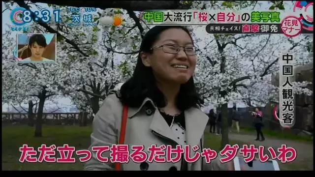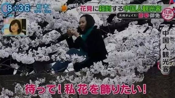 受訪的中國遊客被問到:「為什麼要碰櫻花」,回答:「中國人很愛親近大自然。」