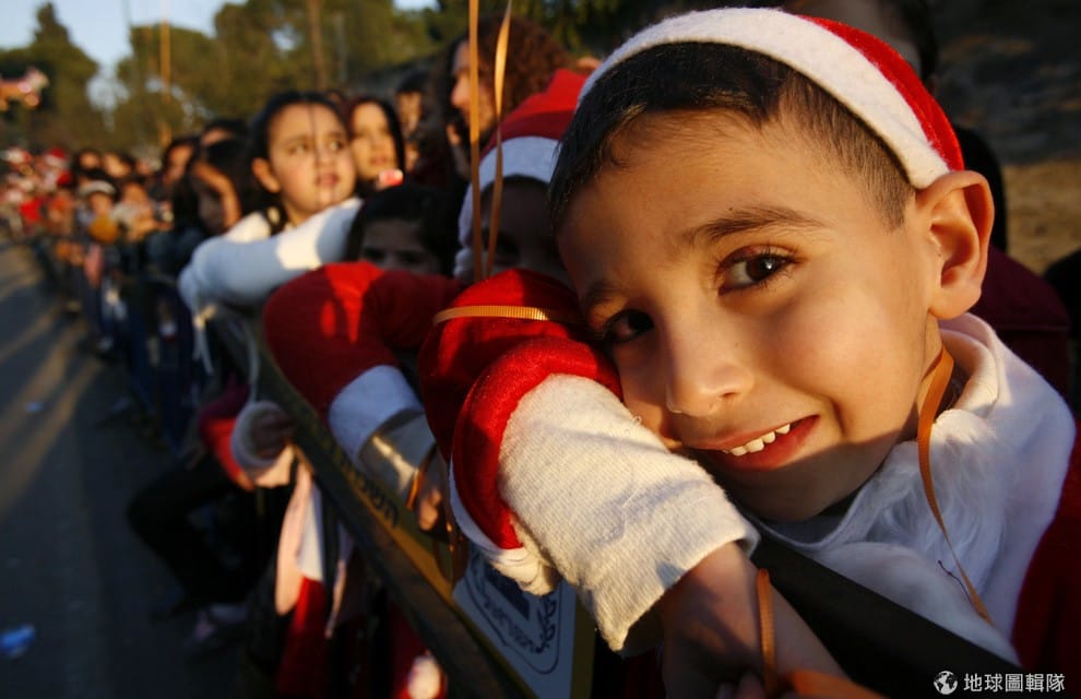 以色列阿拉伯小朋友打扮成聖誕老人的樣子。