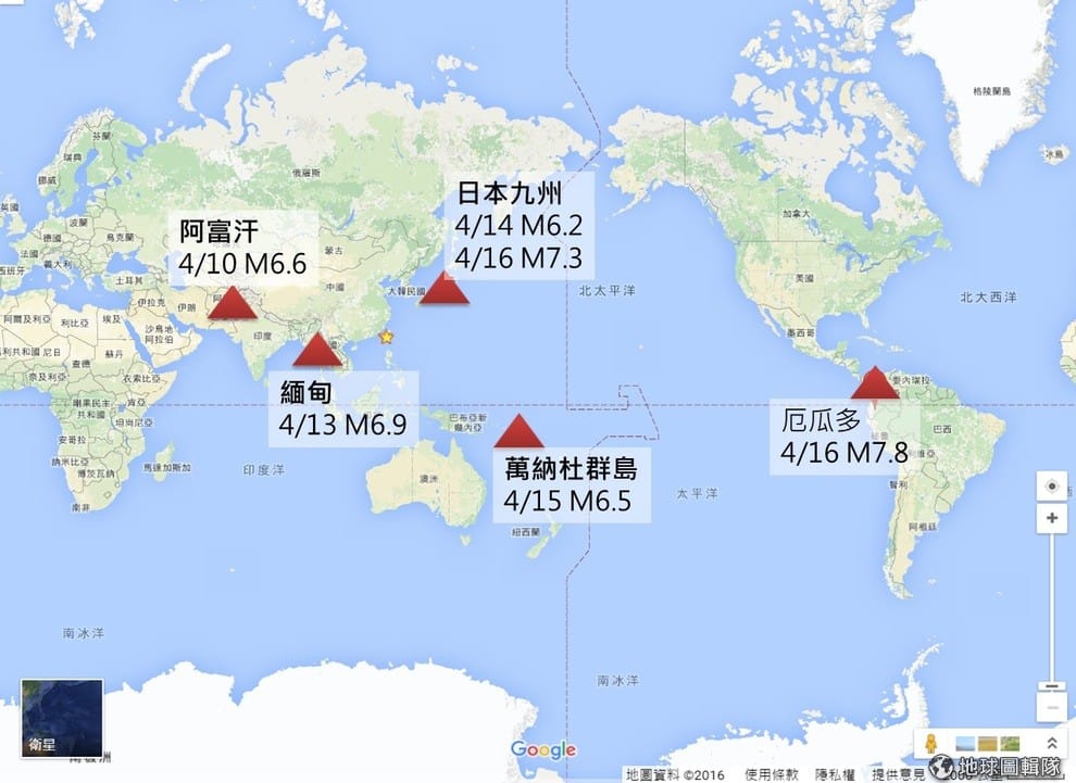 厄瓜多強震發生前,日本熊本縣在 16號及14號才傳出規模 7.3與 6.2地震,造成多處民宅以及校舍倒塌和數百人傷亡。不久前緬甸在 13號以及阿富汗在 10號時也傳出嚴重地震災情。