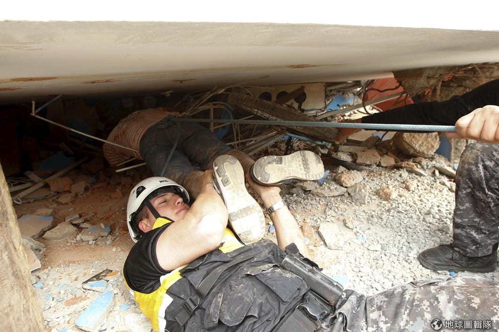 救難人員帶著搜救犬在瓦礫中來回搜索生命跡象。