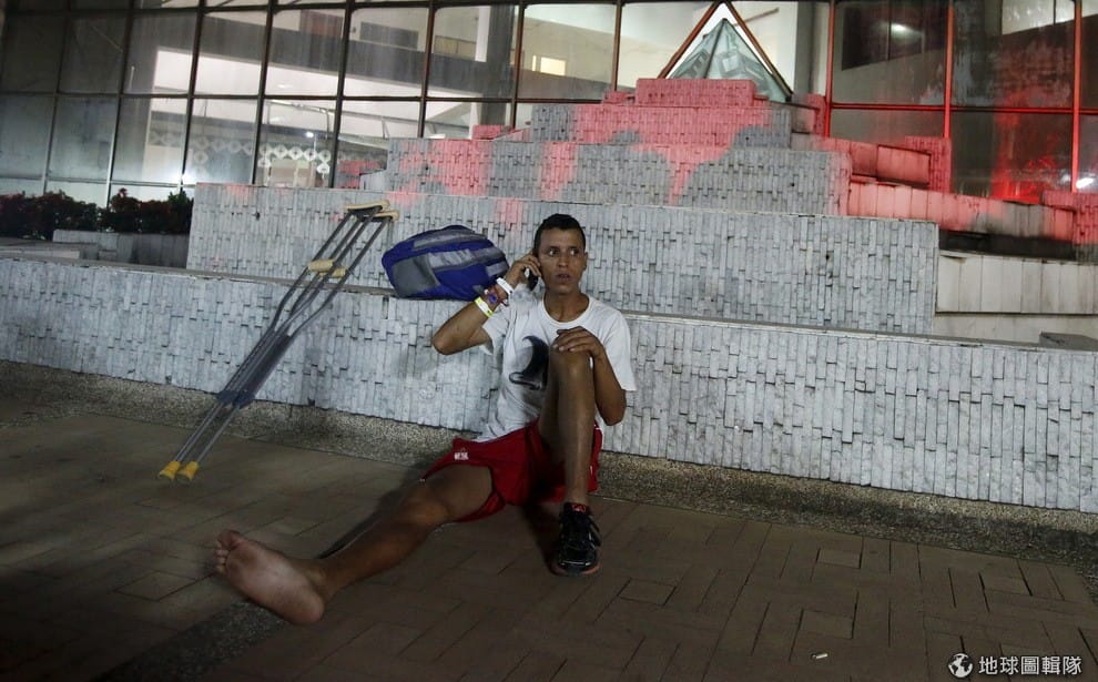 一名從診所中撤離的傷患待在室外。