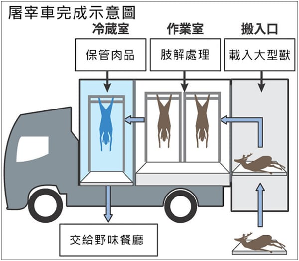 有鑑於此,野生鳥獸料理的全國性組織「日本野味振興議會」與汽車製造商合作,研發可以直接開到捕捉地點的屠宰車。他們在2噸貨車內設置冷藏室和作業室,每次最多可處理5頭鹿。