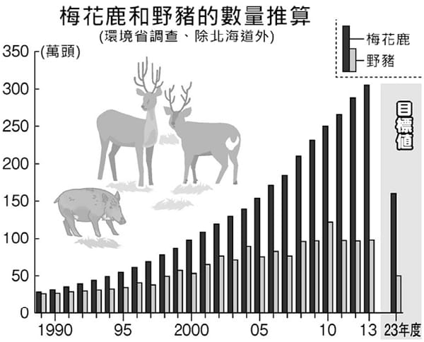 日本政府目標在2023年以前將梅花鹿和野豬的數量減半。 取自日本農業新聞