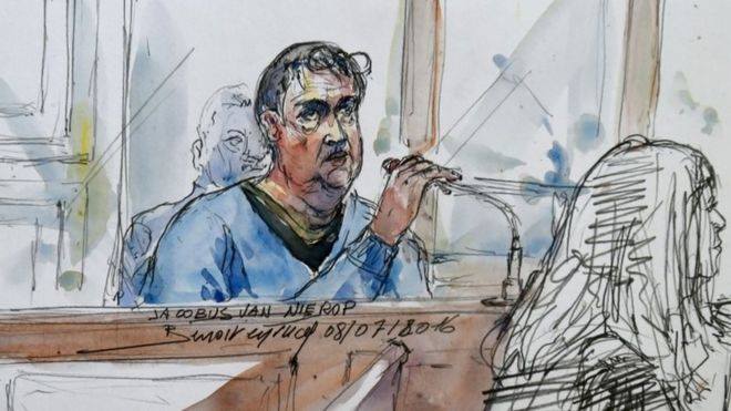 法院繪師將「恐怖牙醫」范尼洛普出庭的樣子畫了出來。范尼洛普曾在開庭前遠走加拿大,企圖逃避法律的制裁。