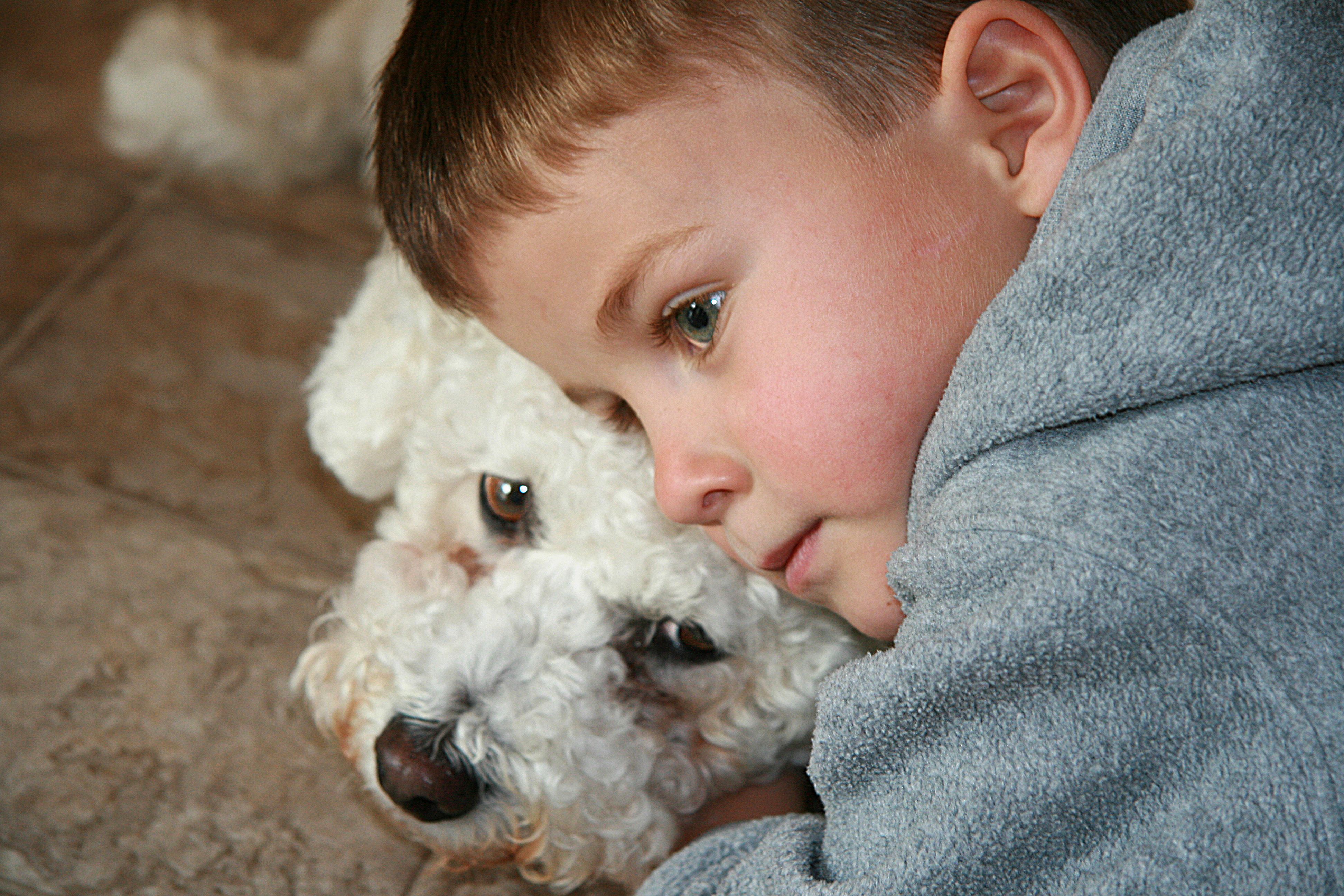 一名小男孩緊緊抱住白色捲毛狗,這個動作可能讓狗兒不安。