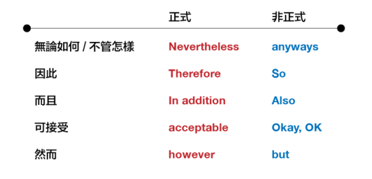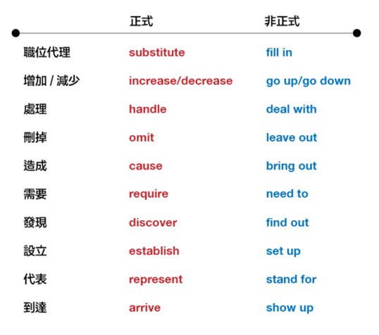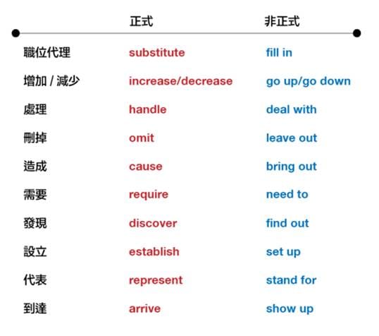 其實正式和非正式比語感來得單純,在慢慢培養語感之前,先抓到幾個關鍵,搭配這裡幫你整理的對照表,一點都不需要擔心太正式或不夠正式的問題: