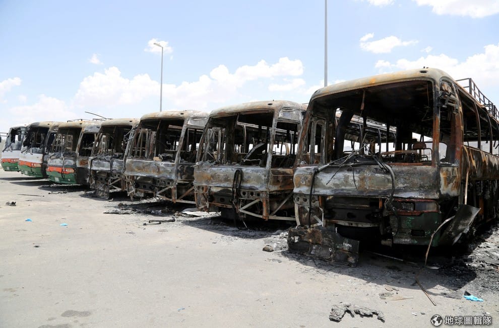 影片中可以看到,一排沙烏地賓拉登集團的公車起火,現場濃煙密布火光亂竄。