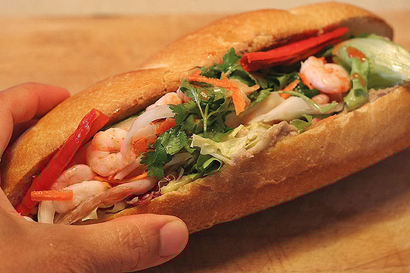 越南人會在法國麵包中夾入清爽的小黃瓜條、蘿蔔絲和火腿等料,做成好吃的三明治。