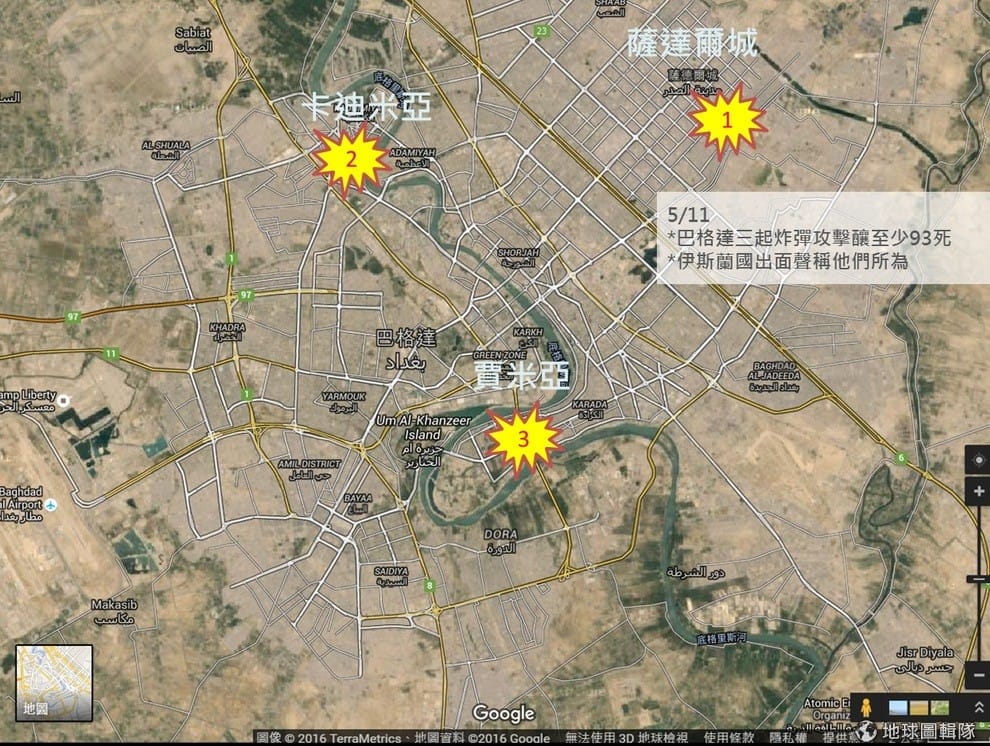 上圖是巴格達在 11號遭到炸彈攻擊的三個地點,這次攻擊釀成近百人死亡。