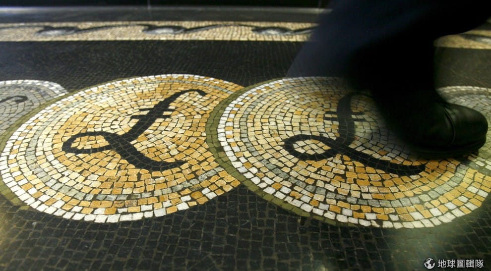 一名雇員走過英國央行的馬賽克地磚,地磚拼貼出英鎊的符號。