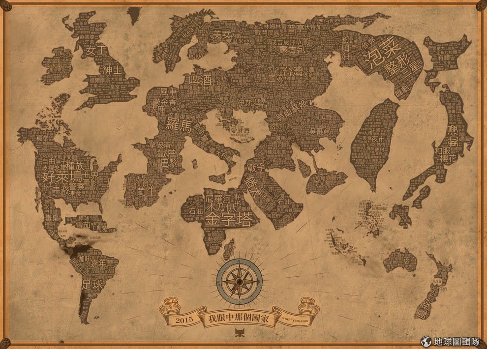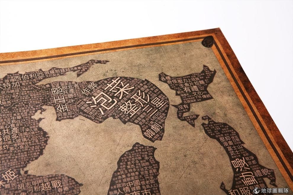 地球圖輯隊與大家一起合作出來的《台灣人眼中的世界地圖》,每一國的位置都寫上了台灣人對該國的印象及世界觀,字體越大表示越多人這樣覺得。