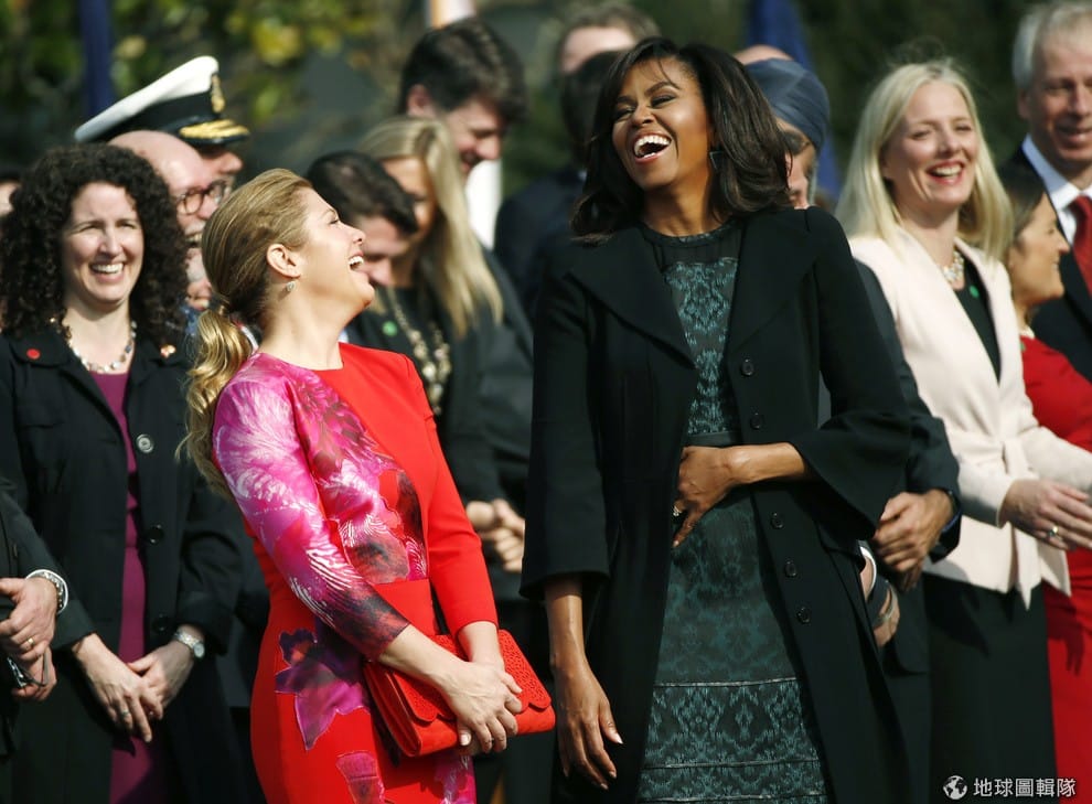 今年三月,蘇菲陪著總理丈夫杜魯道一起出訪美國,和美國第一夫人蜜雪兒歐巴馬(右)相見歡。