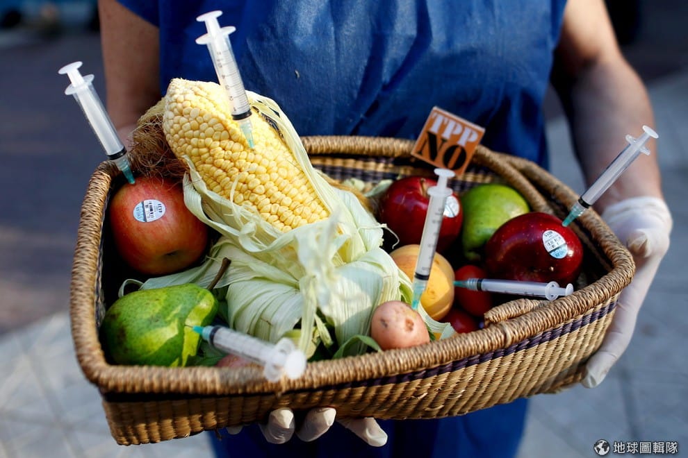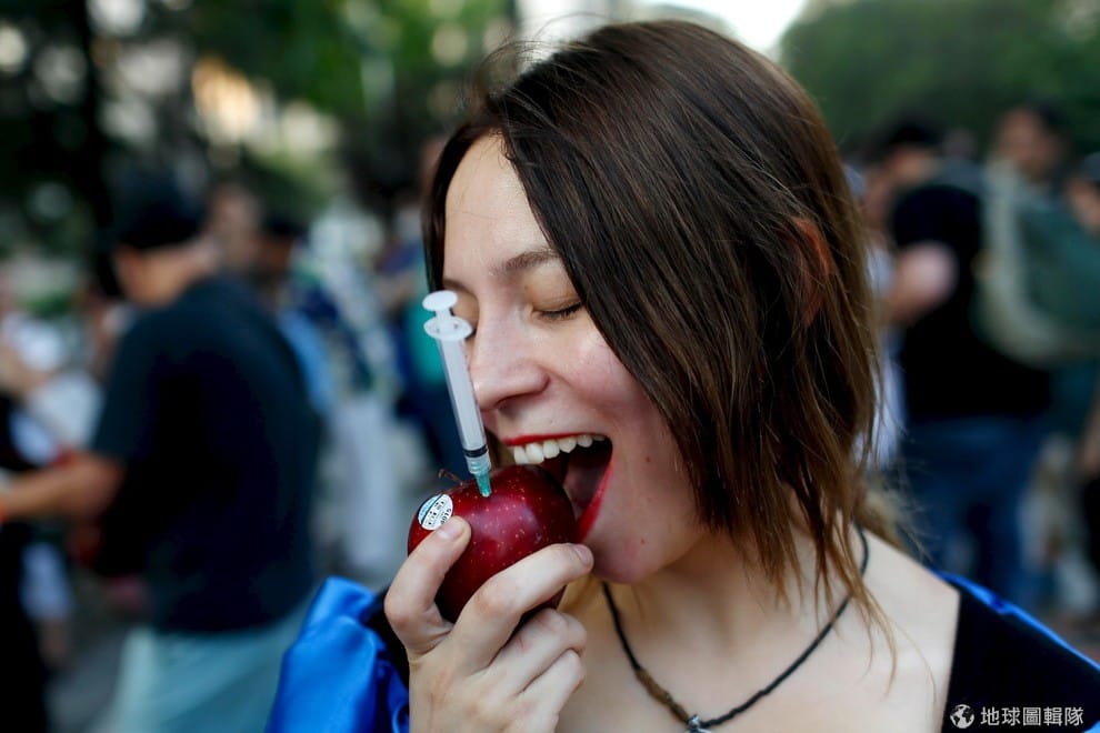 女子拿著插上針筒的蘋果作勢咬下,她與其他人抗議世界最大種子商孟山都(Monsanto)以及 「跨太平洋夥伴關係」協定(Trans-Pacific Partnership,簡稱TPP),於是走上聖地牙哥的街頭示威。